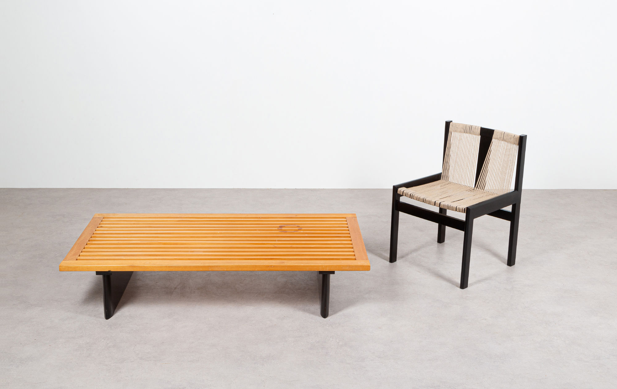 This set of two chairs is the second series produced in about 400 pieces. The front leg of this series is assembled at right angles. On the first series, the assembly is at the mitre. Frame in black lacquered beech, seat and backrest in hemp rope. The chairs are entirely original from the '50s, they have some traces of wear. Produced in the workshops of Kurt Thut between 1955-1960. We do not separate the pair.