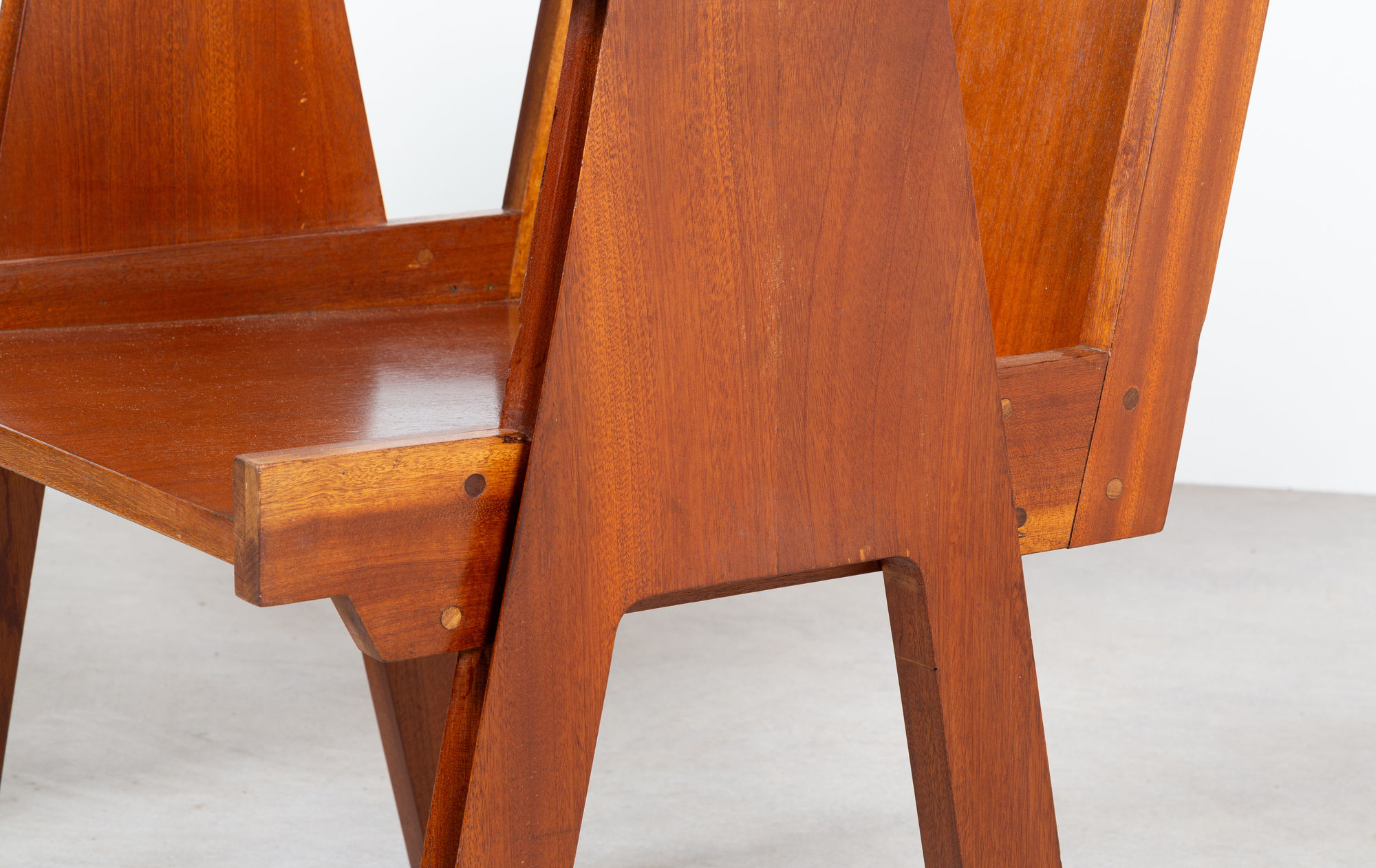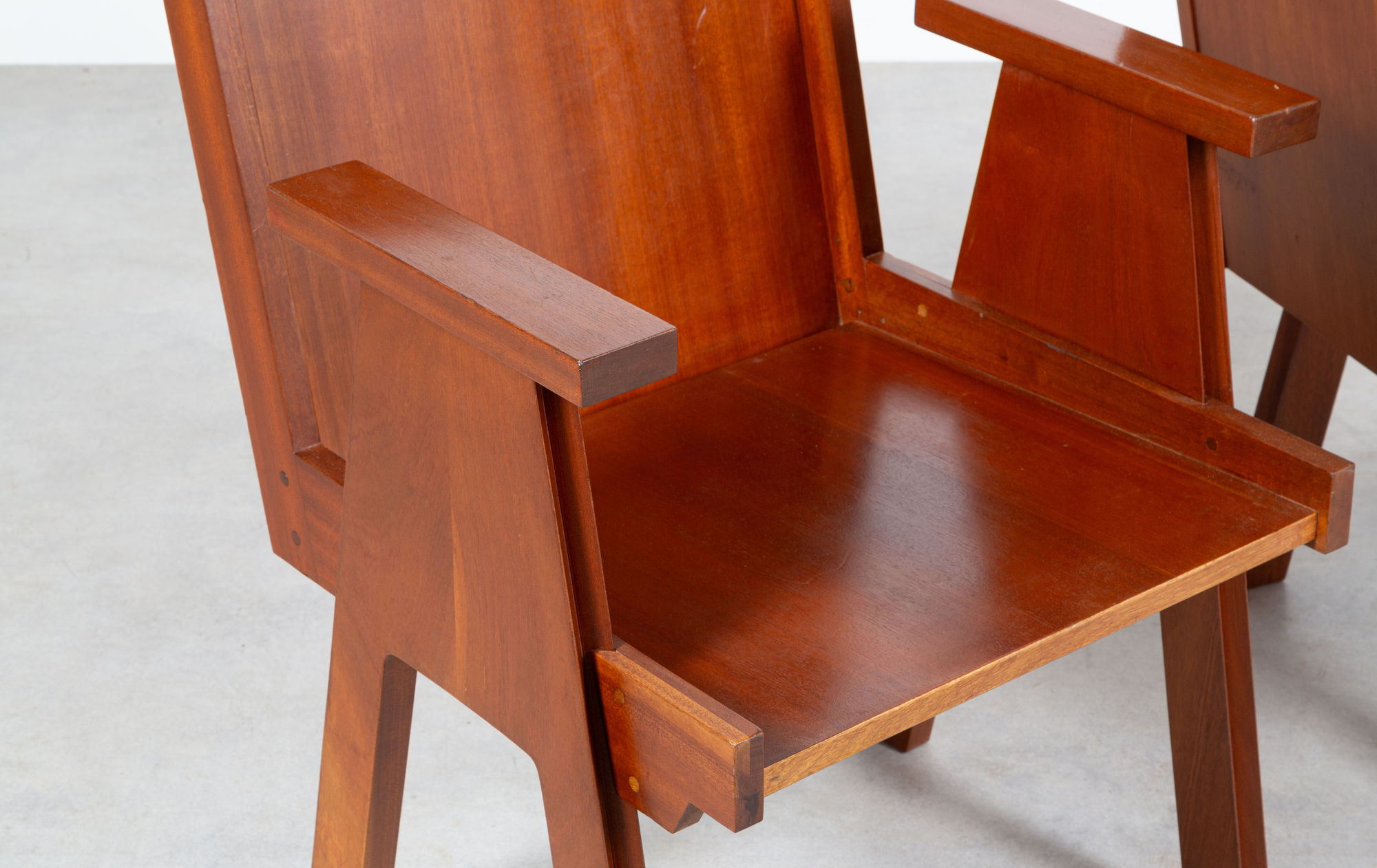 Rare armchairs by Italian designer Angelo Mangiarotti, who in 1957 designed the interior of Club44. A cultural club located in La Chaux-de-Fonds where numerous personalities from the world of the arts rubbed shoulders. Around 300 seats were created for Club44. Frame in solid mahogany, seat and back in mahogany veneered panels with solid mahogany side bracing. Cushions certainly original (which is why we've kept them as they are). It would be easy to remake new cushions, we leave the choice to the future buyer ) The cushions are in average condition with several stains and wear. The seat is in very fine original condition, with traces of normal use for this type of chair. Sold separately.