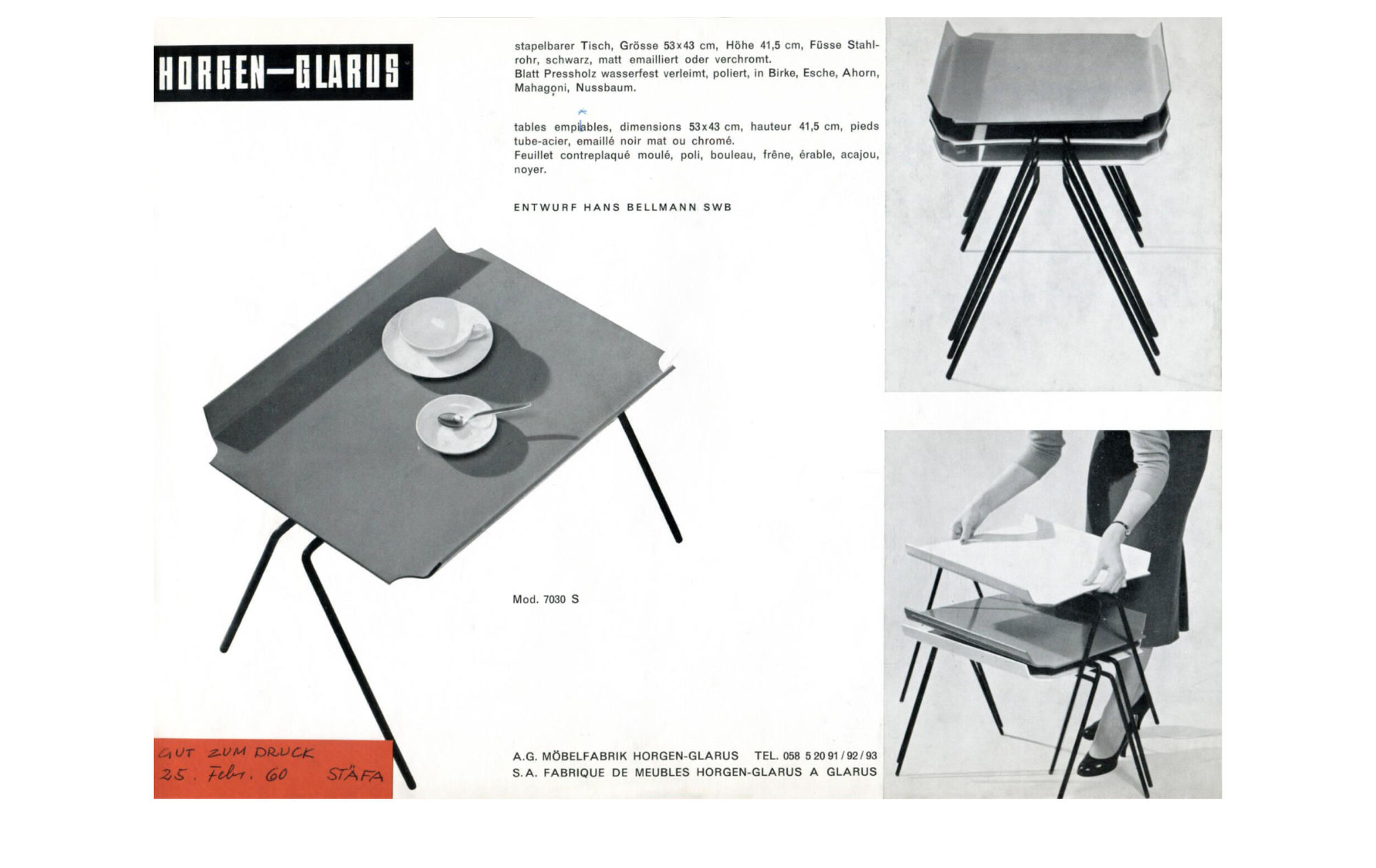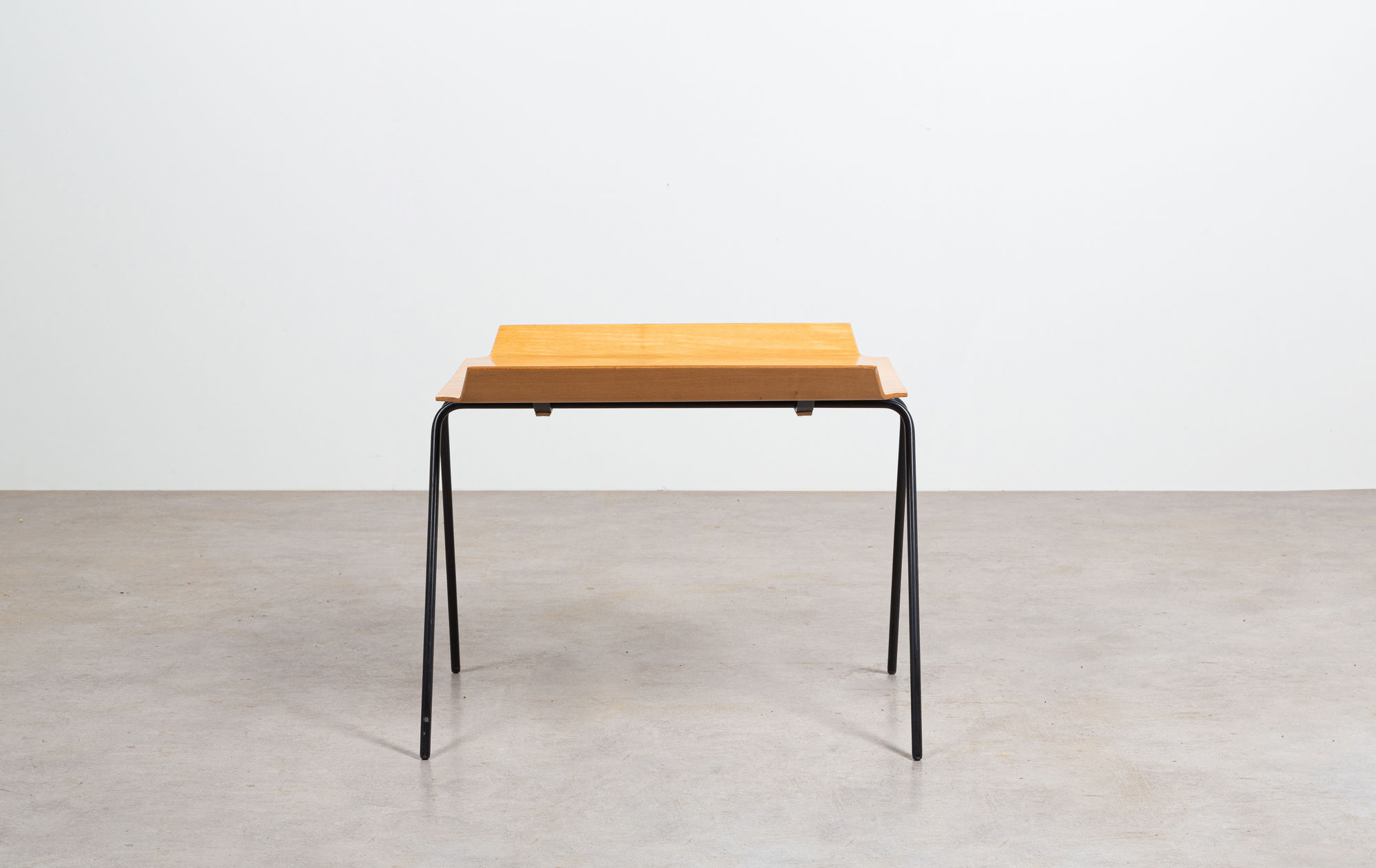 Emblematic side table designed by Hans Bellmann in 1954 for the Horgen Glarus factory. Produced until the '70s. The table we offer dates from 1958, in rare and exceptional original condition. Top in thermoformed maple (polished waxed finish), base in black lacquered steel. Publisher's label under the top. Slight traces of use.
