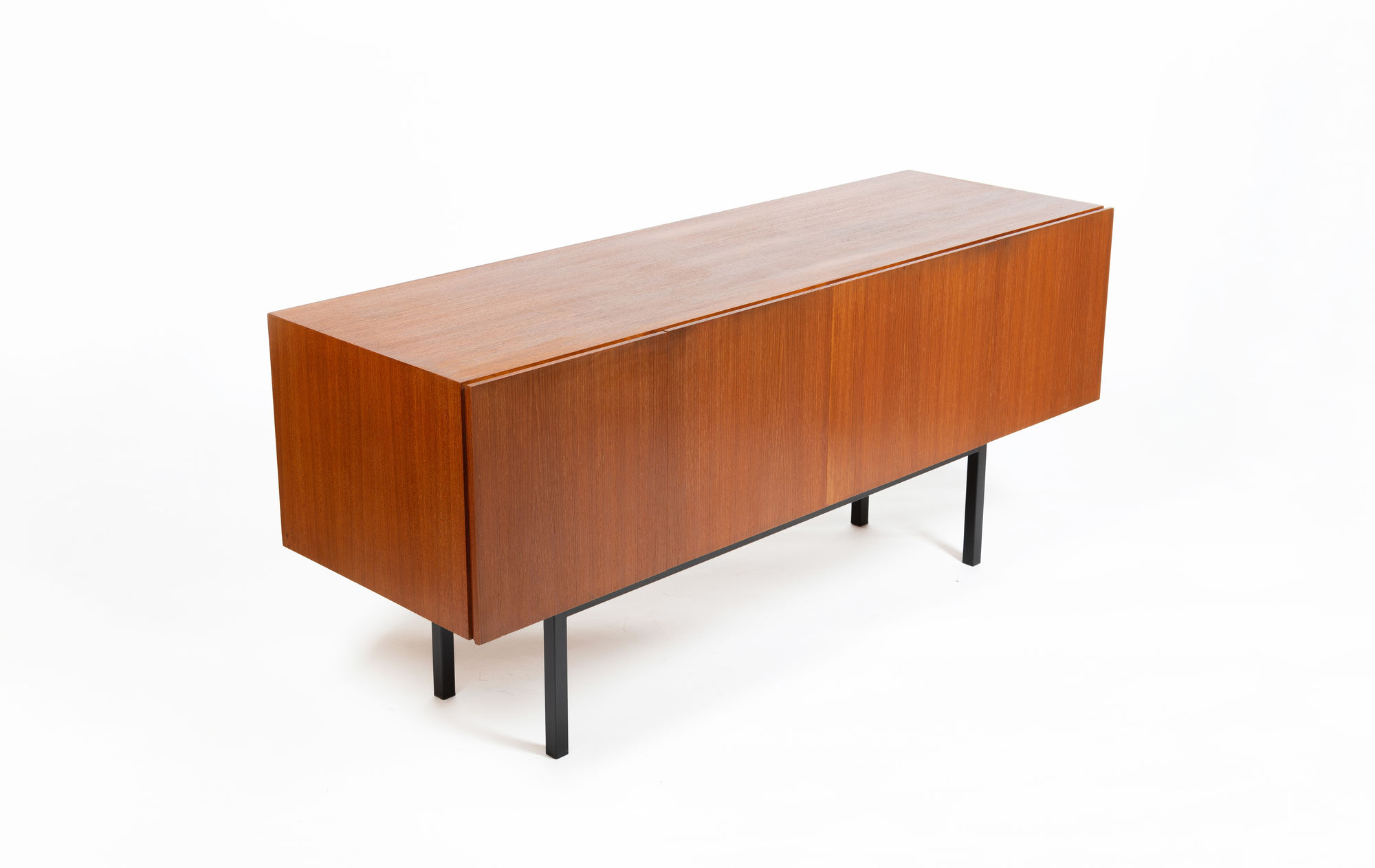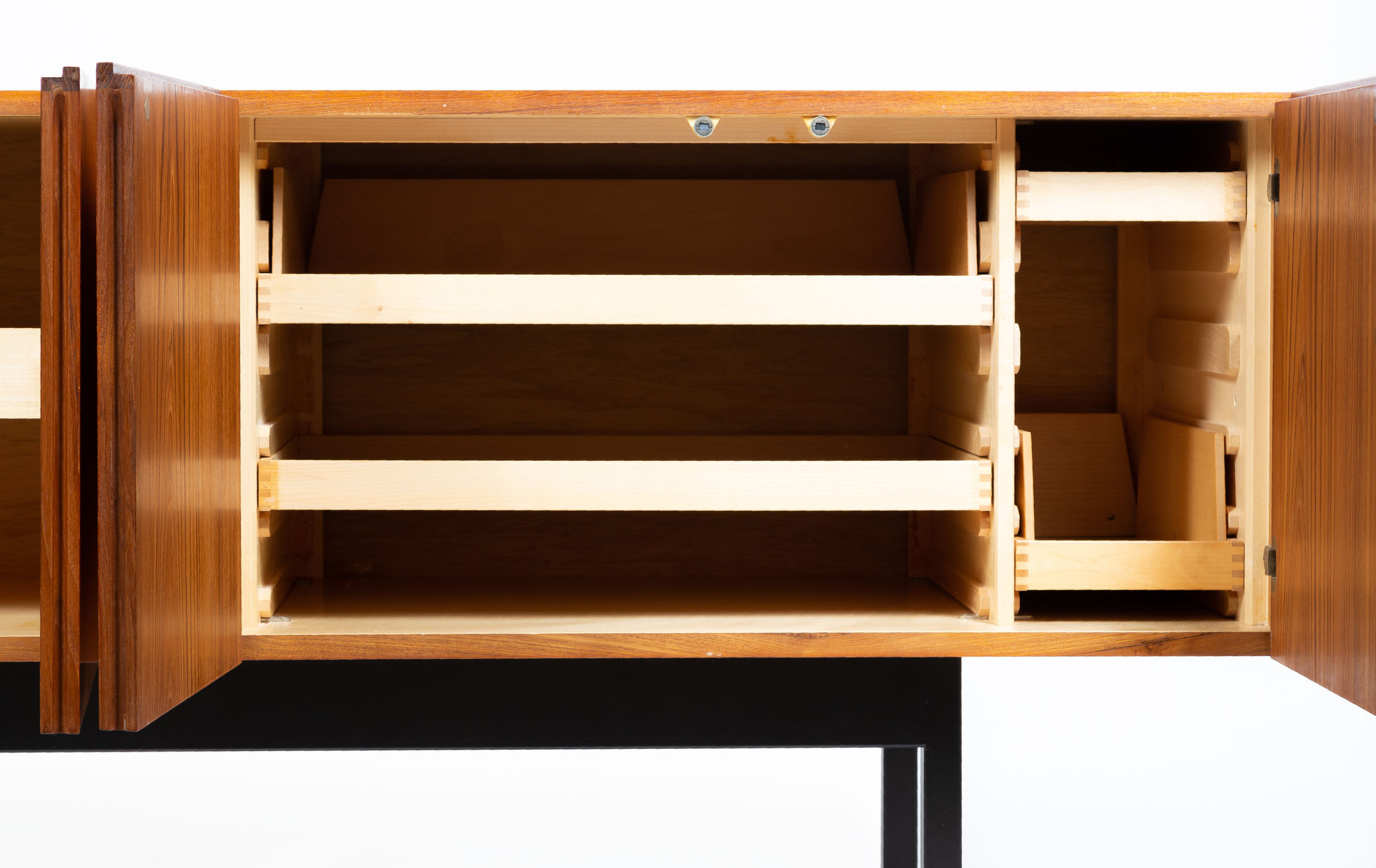 Beautiful minimalist sideboard by Dieter Waeckerlin. Designed for the Swiss Manufacture Idealheim, circa 1960. Teak case, maple interior, black lacquered steel frame. Good original condition with slight signs of use.