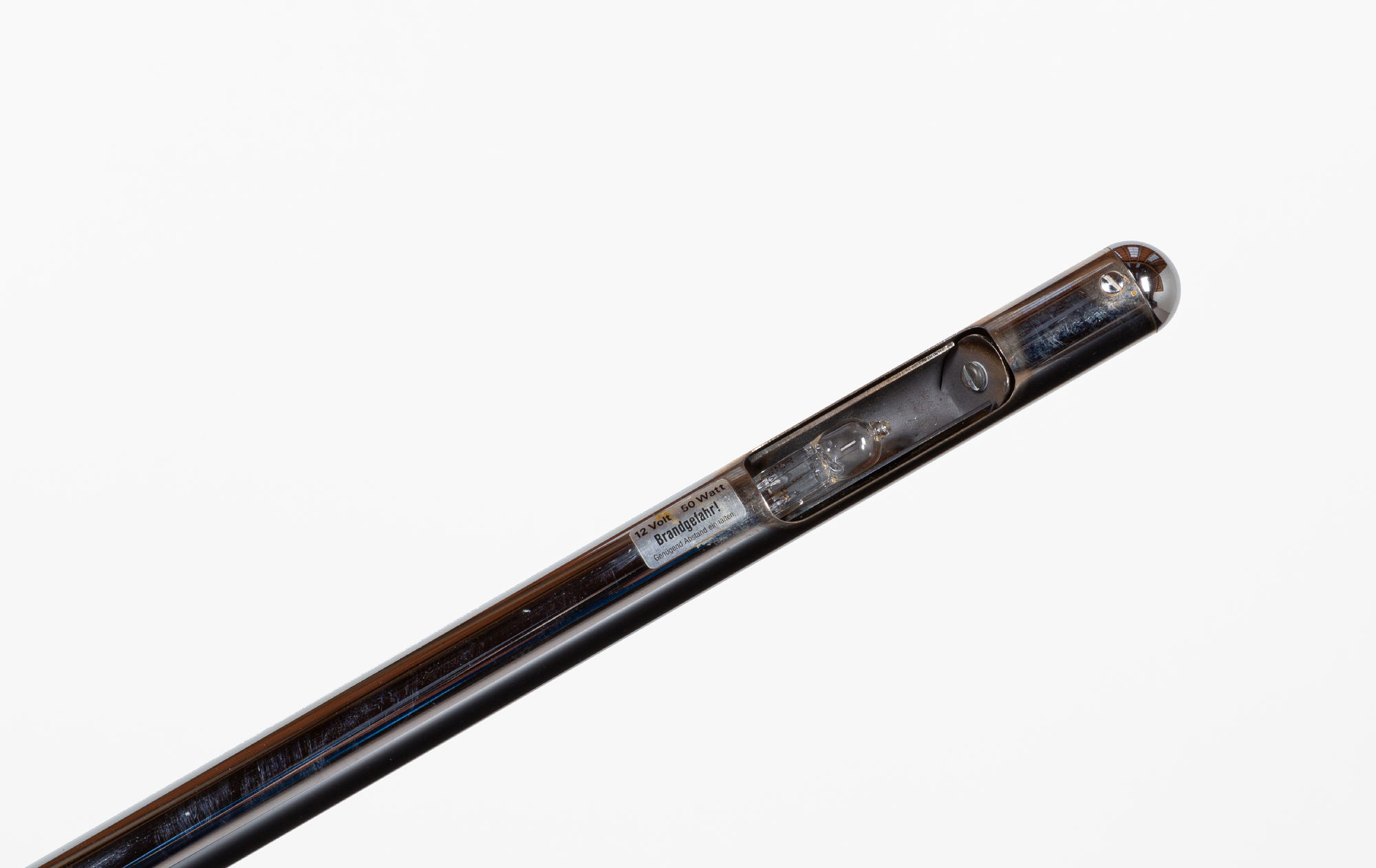 The lamp is made of chromed steel and can be adjusted by moving the support element. The model that we present, is the first version of this lamp with the halogen bulb, around 1985-90. Possibility of two power of lighting with the small switch fixed on the steel tube. The lamp is in very good condition with slight wear.