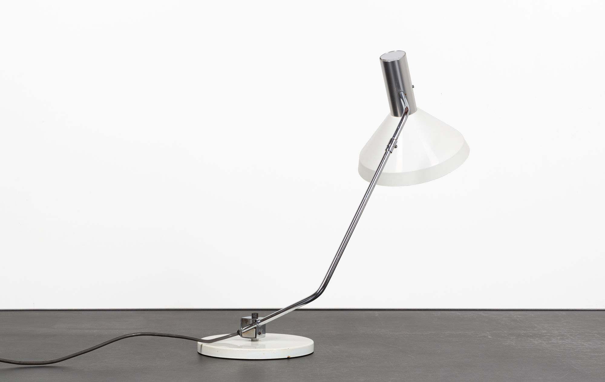 Table lamp designed by the Baltensweiler couple in 60s. Production in their workshop in Ebikon. Produced only a few years. Chromed steel rod and base in white lacquered cast iron. Original label under the base. Good original condition.
